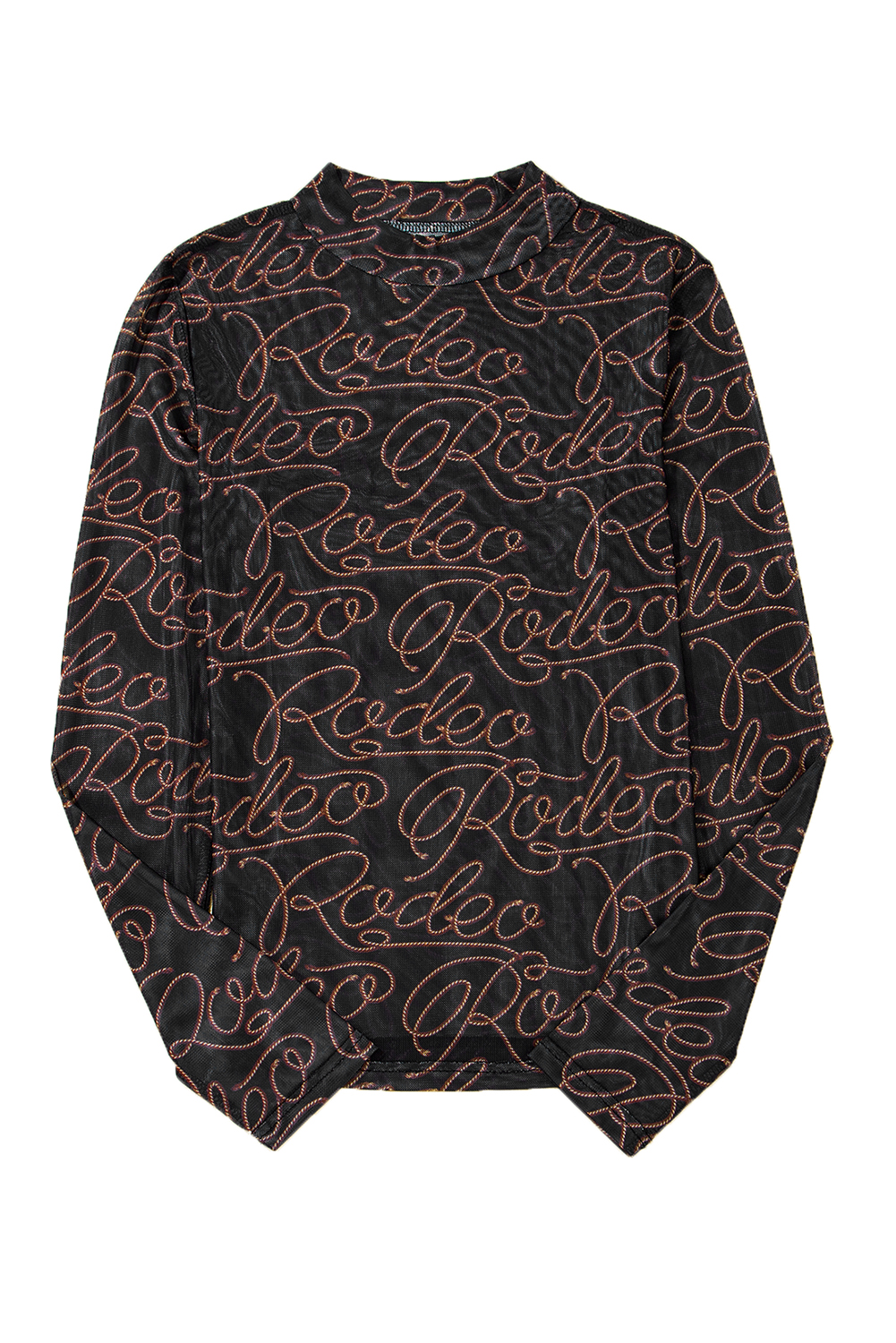 Black Western Rodeo Printed Mock Neck Long Sleeve Mesh Top
