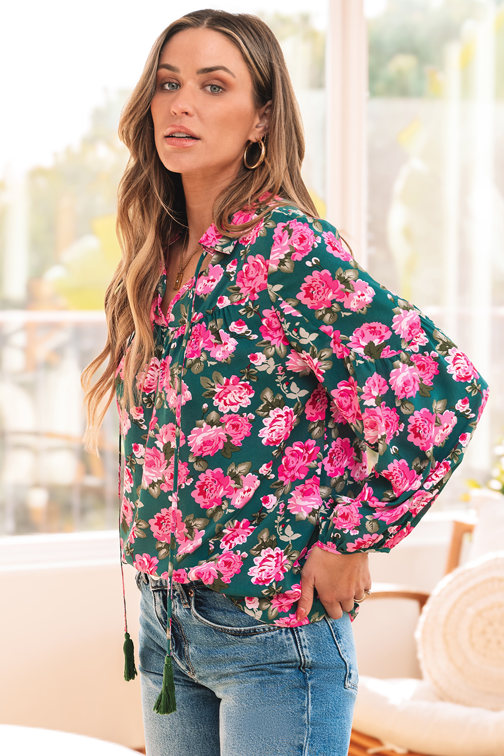 Green Floral Printed Tied Collar Puff Sleeve Blouse