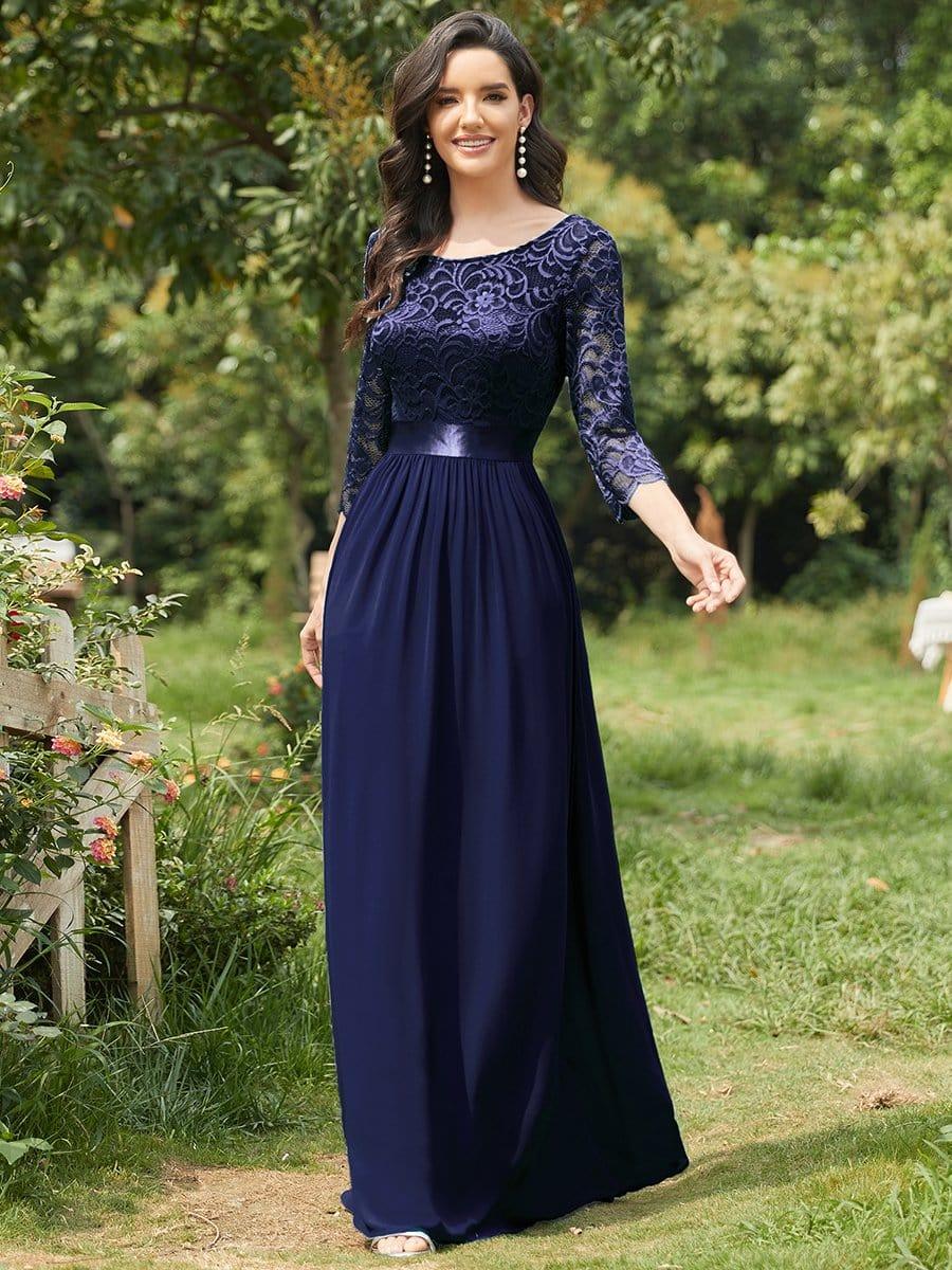 See-Through Floor Length Lace Chiffon Evening Dress with Half Sleeve – Navy Blue